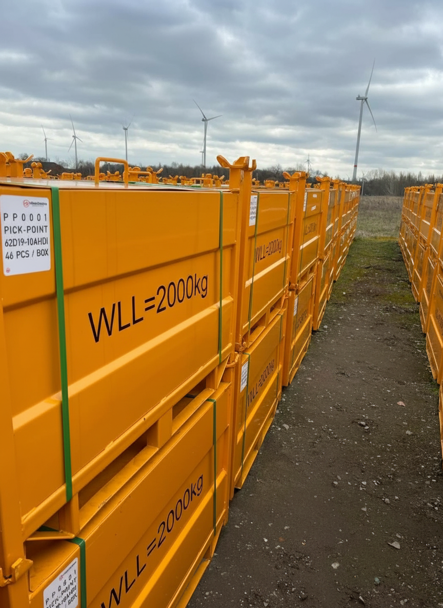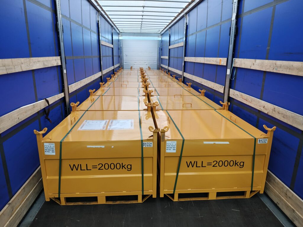 Fits 20″ and 40″-foot containers, is easy to move with a forklift and marine certified for lifting with a standard green pin system.
